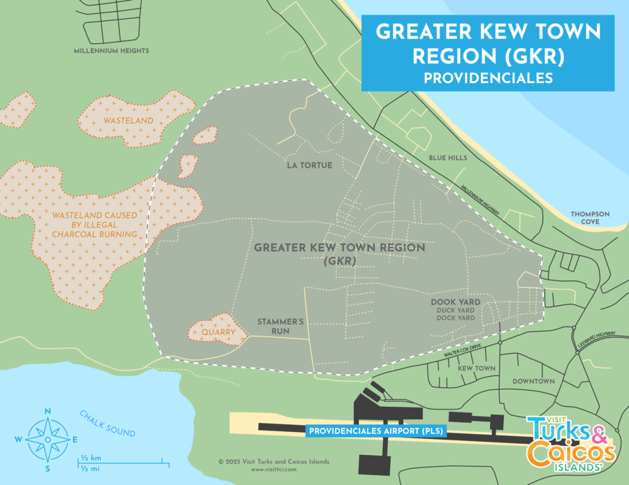 Walter Cox Drive in Kew Town, near the Providenciales International Airport (PLS), is generally considered the region's rough southern boundary, and Millennium Highway the northern boundary.