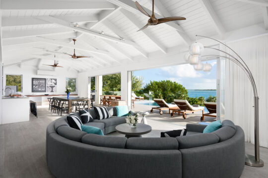 The spacious formal living room is a spectacular entertaining space with exposed beam vaulted ceilings, multiple ceiling fans, and sliding glass doors with panoramic pool and turquoise water views. A stylish circular sectional sofa brilliantly enhances the formal living room, while an additional casual living room offers a comfy sofa, accent chairs, a flat-screen TV, and a library.